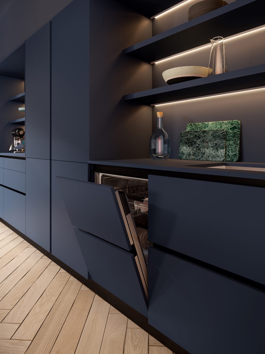 Матовая кухня — это результат использования современных материалов и технологий обработки. Основа фасадов — ДСП и МДФ.