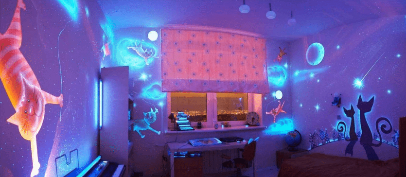 Материал используют для декора внутренних и наружных поверхностей зданий. Также с помощью светящейся эмали легко своими руками декорировать любой предмет, создав неповторимое украшение для своего дома или подарок другу. Имея художественный талант, флуоресцентной краской можно нарисовать уникальную картину, которая украсит внутреннюю стену или фасад. Чаще всего такие решения применяют в декоре ночных заведений – клубов, ресторанов и т.п.