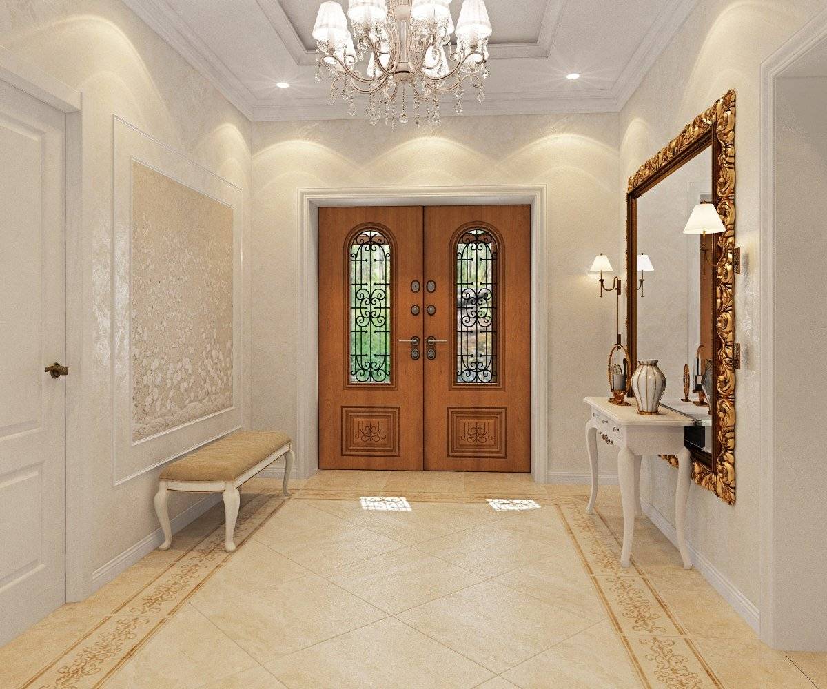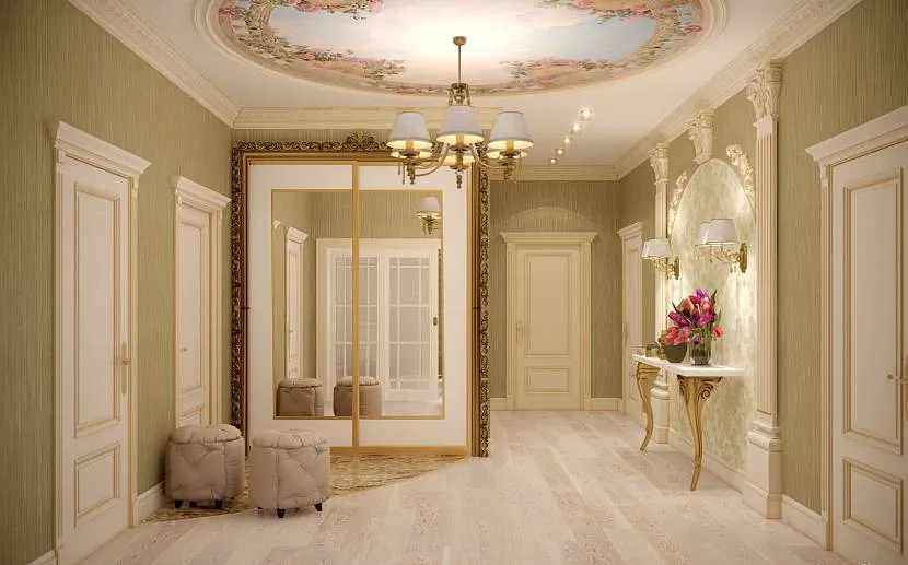 Когда для гостиной выбрана роскошь классического стиля, то в такую залу должен вести соответствующий коридор. Если есть мебель, то только резная. Как один из вариантов – безупречно отполированное черное или красное дерево. На стенах мозаика или зеркала в причудливых рамах. Приветствуются и картины. И даже в маленьком помещении на потолке уместна большая люстра в окружении лепнины.