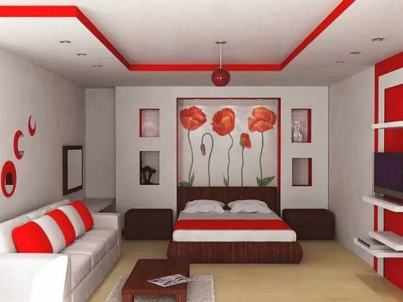 - Белый с красным или черный с золотым. Красный цвет в больших количествах визуально уменьшает комнату. Поэтому с ним нельзя переборщить. Его можно использовать при зонировании частей комнаты или чтобы добавить ярких акцентов.