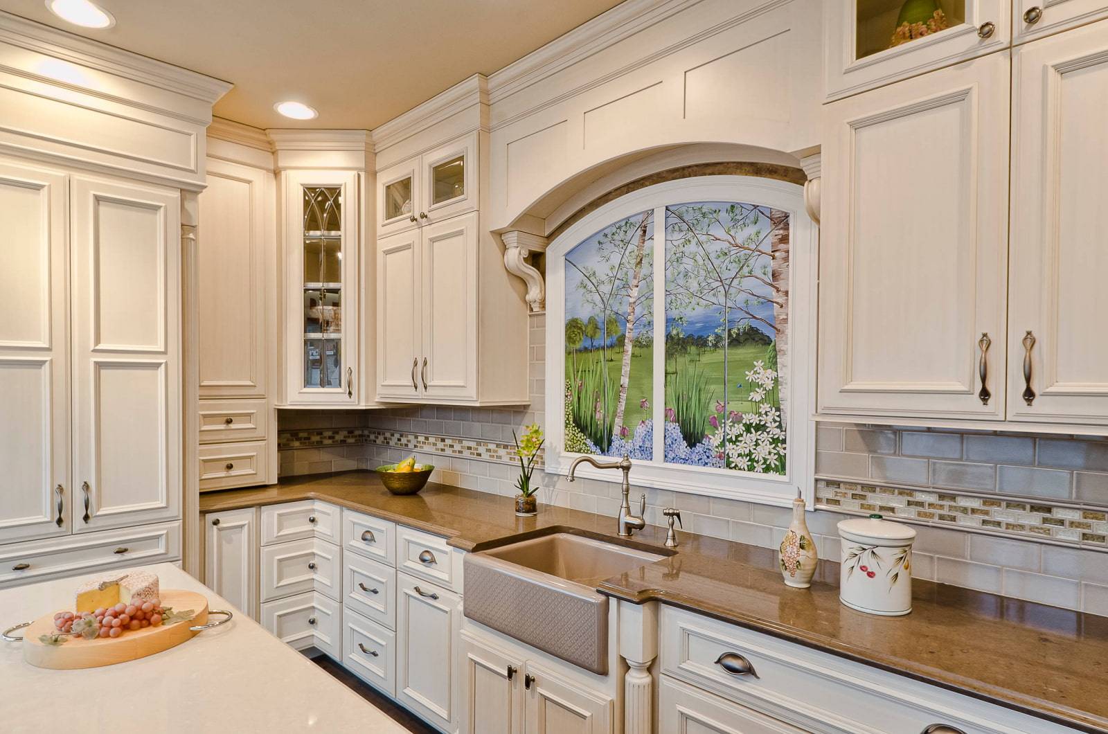 При этом важно, чтобы картина поместилась в ограниченное пространство. Ниши, разделяющие шкафы на рабочей стене, украшают покрытиями, которые имитируют мозаику или старинные гобелены
