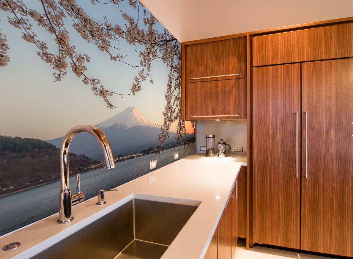 - Фотообои не подходят для отделки рабочей зоны кухни;