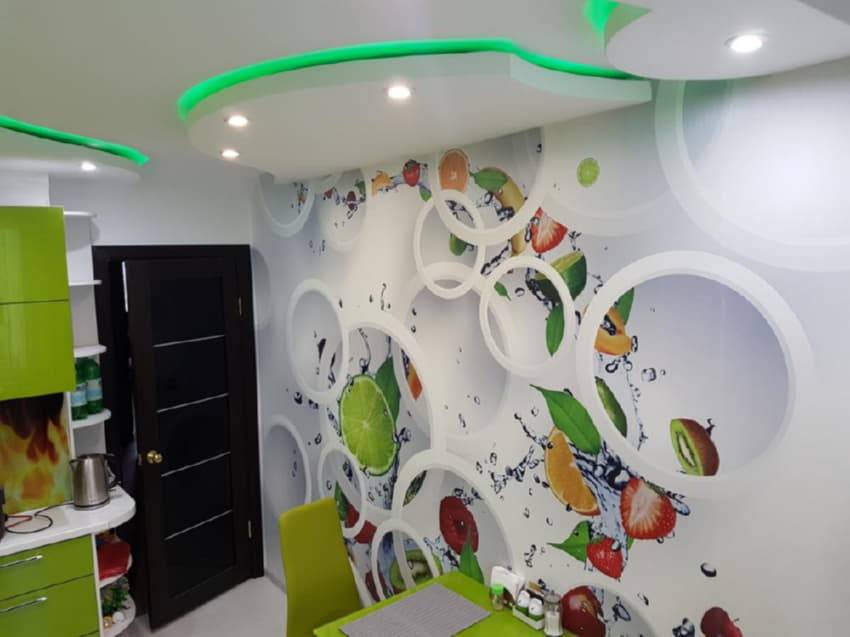 Воплощением современных идей являются 3D-обои. Они обычно сделаны в широком формате и представляют собой объемный рисунок. За счет особой технологии производства, изображение обладает высокой степенью реалистичности. Такой элемент декора способен внести динамики либо, наоборот, умиротворения. Ломтики сочных экзотических фруктов, прозрачные кусочки льда, брызги воды – все это излучает энергию и вызывает аппетит. А ветка цветущей яблони успокоит после трудного рабочего дня и позволит расслабиться за чашкой чая.