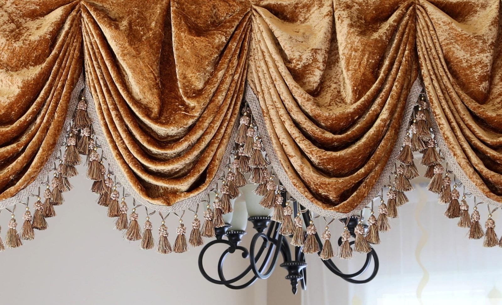 Портьерный велюр и бархат относят к плотным материалам с восхитительными переливами складок. Его используют, в основном, в качестве компаньона к гладким гардинам. Пошив по-французски с множеством фестонов на шнуровке – плотные части штор, применяемые для простенков или под фальш-окна.