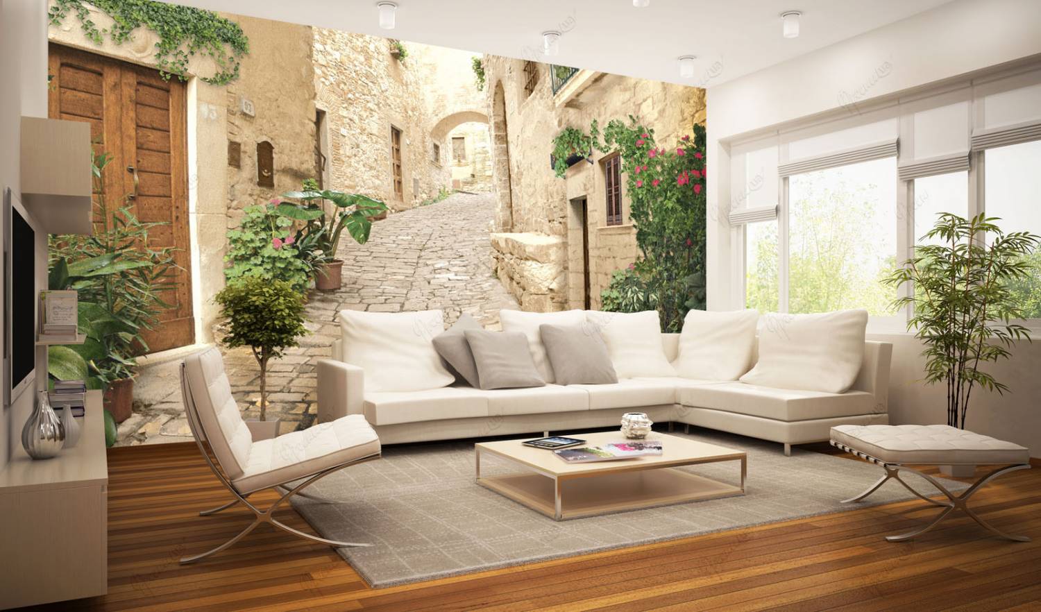 Создание фрески в интерьере обычных городских квартир может быть делом весьма нетривиальным, даже если это простые фотообои, особенно когда требуется красочное оформление труднодоступных поверхностей, закругленного коридора, или сложных конструкций, таких как лестница, например. Самоклеящиеся фрески отлично справляются с такой оригинальной задачей, хотя и требуют специфической подготовки обрабатываемой поверхности — она должна быть максимально ровной, как отшлифованный камень. Помимо этого, тонкая структура таких фресок не позволяет передавать эффект старения, поэтому они будут больше похожи на обои, но качественные и дорогие, как фотообои фактурного типа.