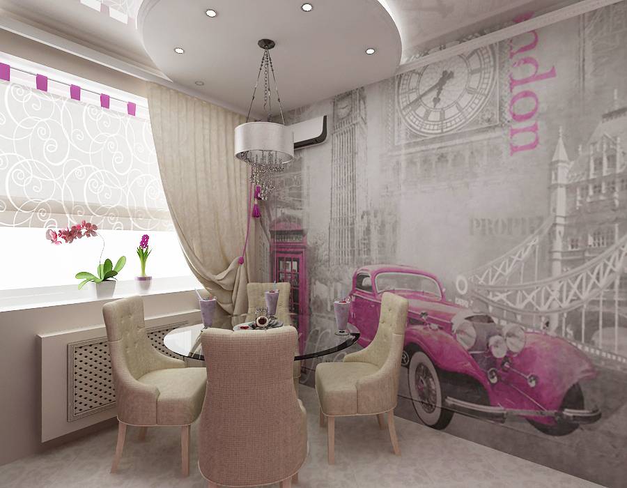 Исправить недостатки помещения с невысокими потолками может изображение крупных соцветий. Популярными являются и пейзажи. Вариант универсальный, так как его можно плавно вписать в любой интерьер. Он придает определенную атмосферу свежести и свободы. В эту категорию включатся изображения лугов, дикой природы, пляжей. Удачным приемом является использование фальш-окон, из которых будет открываться необычный вид.