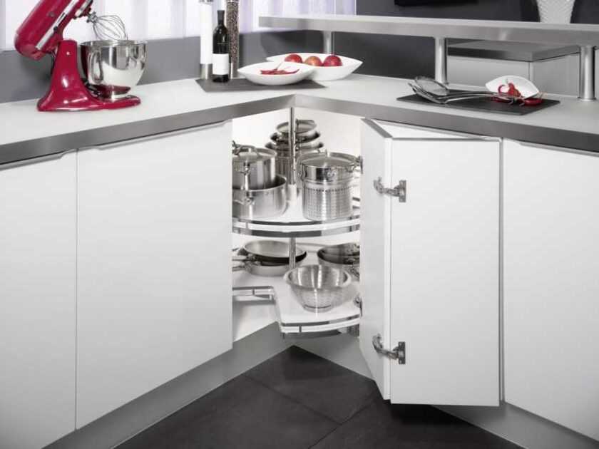 Сделать угловой шкаф более вместительным и эргономичным помогут выдвижные полки, которые при открывании дверцы шкафа с помощью направляющих выкатываются наружу. Полки делают из металла. На них хранят специи, крупы, чашки, кухонный текстиль. Фурнитура в виде полок необходима для малогабаритных кухонь, где место для хранения ограничено.
