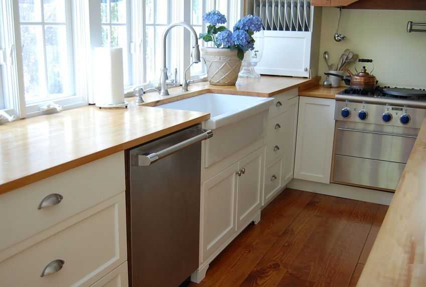 Деревянные поверхности должны стать основными в отделке кухни в деревенском стиле. Если речь идет о русском кантри, лучше использовать необработанную древесину или дерево, на котором специально сделаны потертости. Должно создаваться впечатление, что мебель и некоторые поверхности заботливо сделаны своими руками.