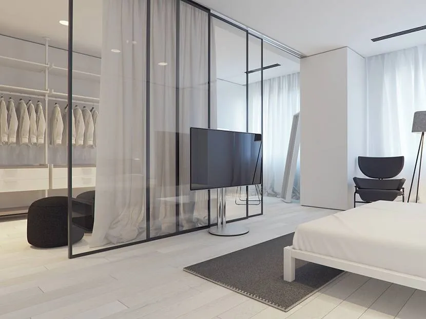Максимальная простота и сохранение свободного пространства поэтому используются только двери купе. Дизайн спальни с гардеробной, оформленной в таком стиле должен быть предельно простым и лишённым любых декоративных элементов.