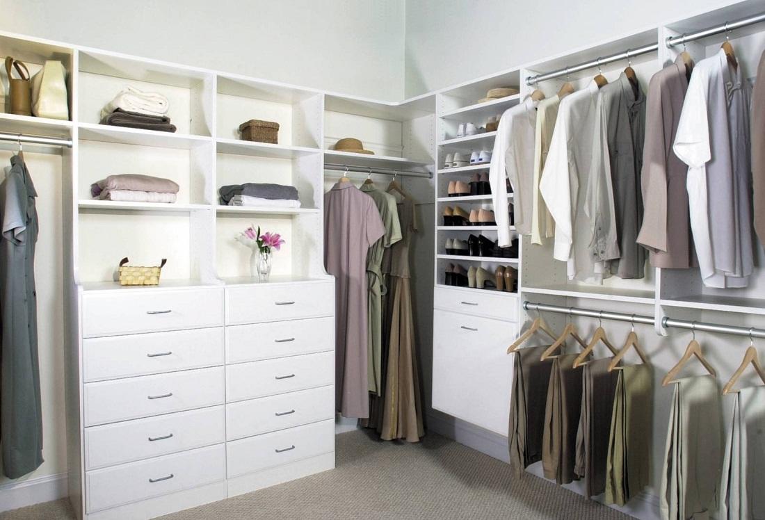Гардеробная состоит из множества отсеков, стеллажей, а также зависит от того, как именно они расположены.