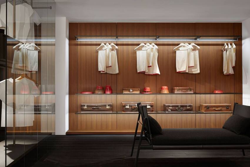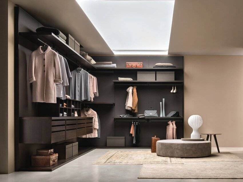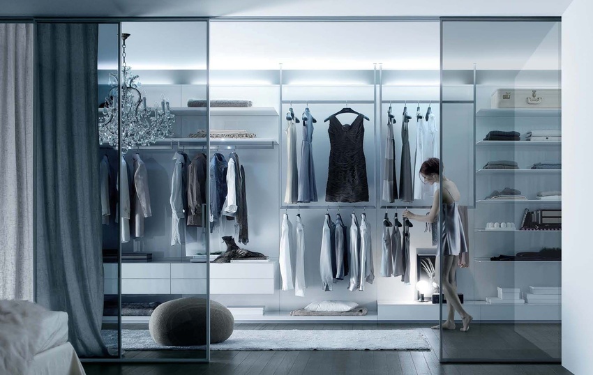 Для конструкции линейного формата отлично подходит как закрытый дизайн, использующий купейные двери, так и открытый, который предполагает большое количество полок и вешалок.