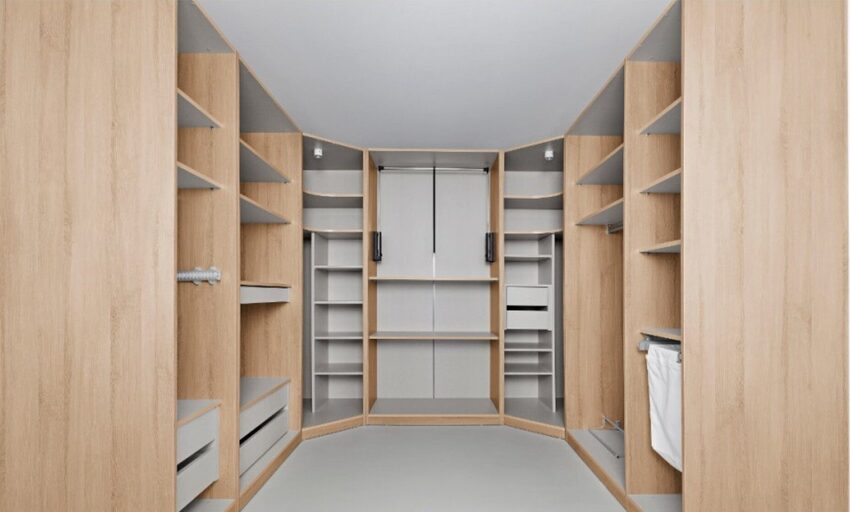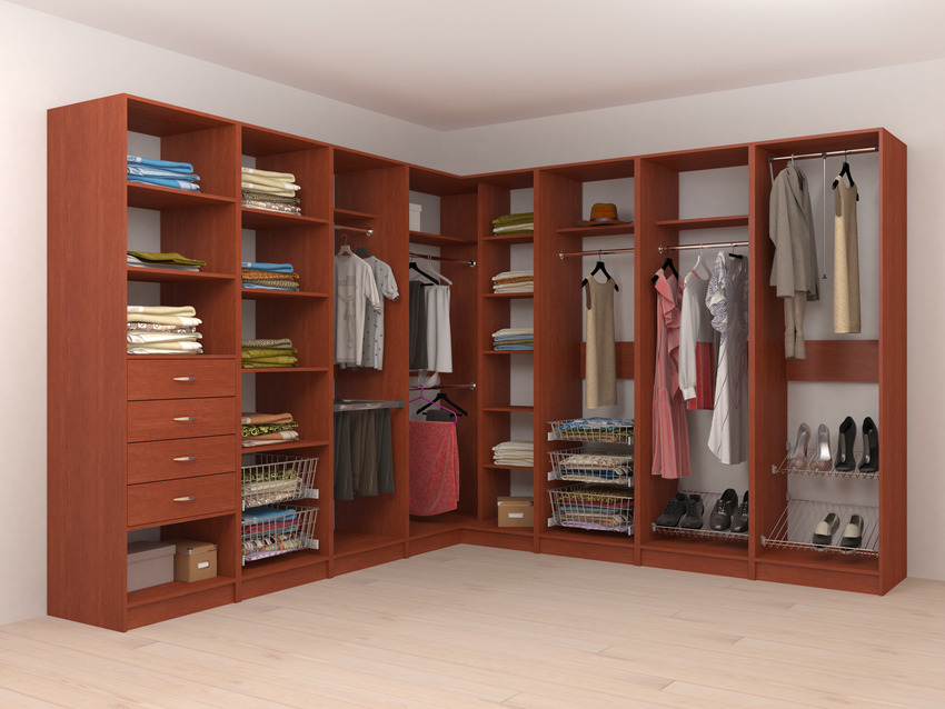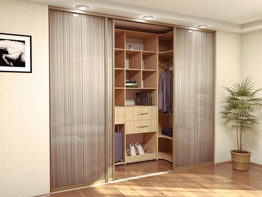 Практика доказала, что угловая гардеробная в спальне имеет массу неоспоримых преимуществ: