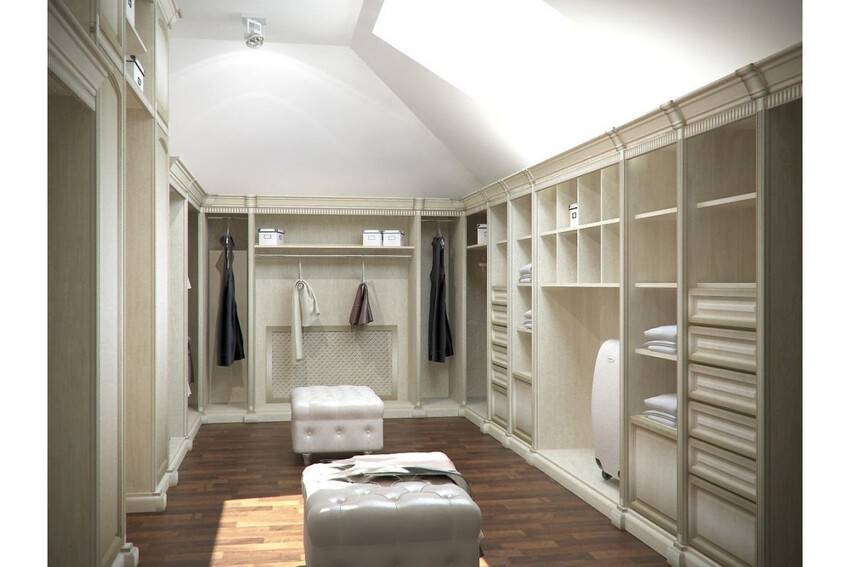 Прежде чем установить в гардеробной мебель, помещение нужно подготовить. В первую очередь здесь должно быть сухо, поэтому нужно создать вентиляцию. Комнату для хранения вещей не рекомендуют создавать в углу здания, который подвержен намоканию и не освещается солнечным светом. Нежелательно, чтобы она имела общую стенку с кухней и ванной. Если здесь нет окон, то для вентиляции можно установить вентилятор, который сможет включаться автоматически через определенный промежуток времени.