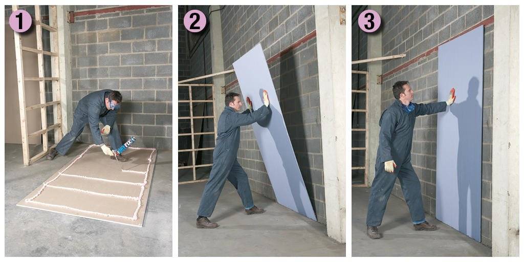 На клей монтируют листы, если стены абсолютно ровные, или поверхность готовят под ламинированные панели гипсокартона с помощью штукатурки. Идеальные поверхности получаются при кладке здания из газобетонных и пенобетонных блоков.