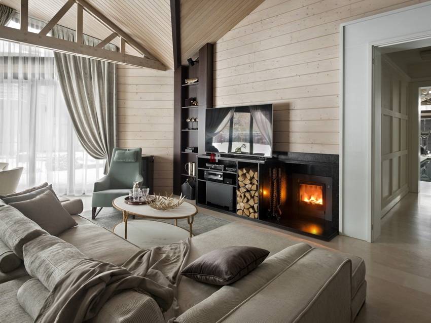 Отличным дизайнерским решением для зала, как в городской квартире, так и в загородном доме, является создание зоны с камином. В оформлении очага используют гранит, кирпич, белые породы камня или фактурную плитку.