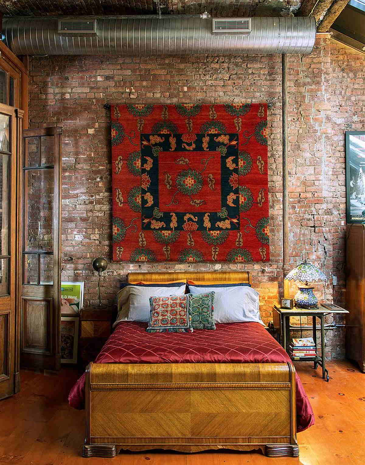 Да-да, именно лофт. Яркие полотна с абстрактными рисунками или винтажными узорами станут изюминкой вашего индустриального интерьера. Только представьте, как оригинально будут сочетаться грубые кирпичные стены с теплым текстилем. Что там представлять, вы и так все видите ниже. Тем более такие полотна помогают визуально выделить зоны для сна и отдыха.