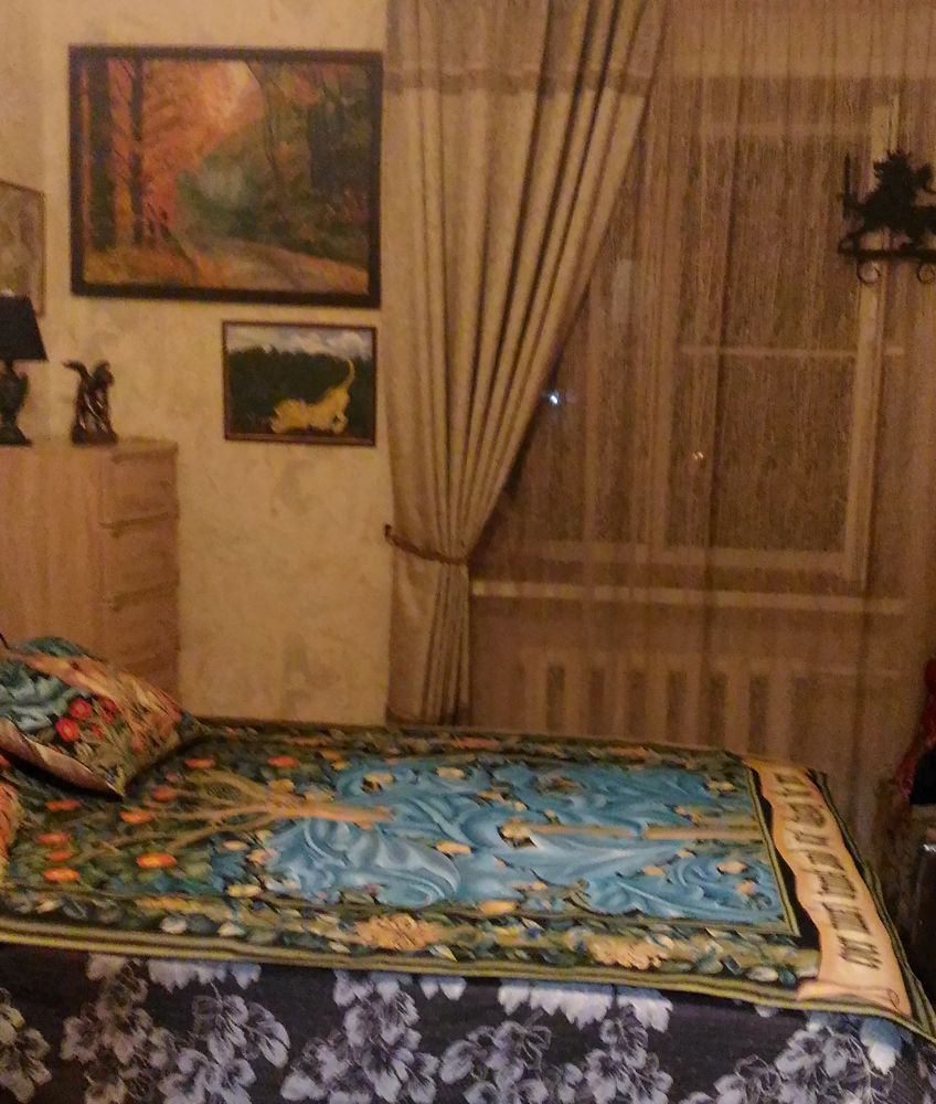 Интерьер от Марины Р. (Хабаровск). Марина — любитель старинных гобеленов. Гобеленовое панно Дятел (на кровати в качестве покрывала)