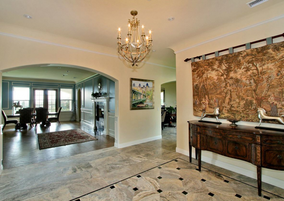 Сюжетные гобелены, напоминающие те, что наши предки ткали вручную, будут отлично смотреться в классической гостиной. Золотистые нити в текстильных коврах прекрасно сочетаются с блеском роскошных люстр и бра, перекликаясь с позолоченными элементами декора рам для зеркал и картин.