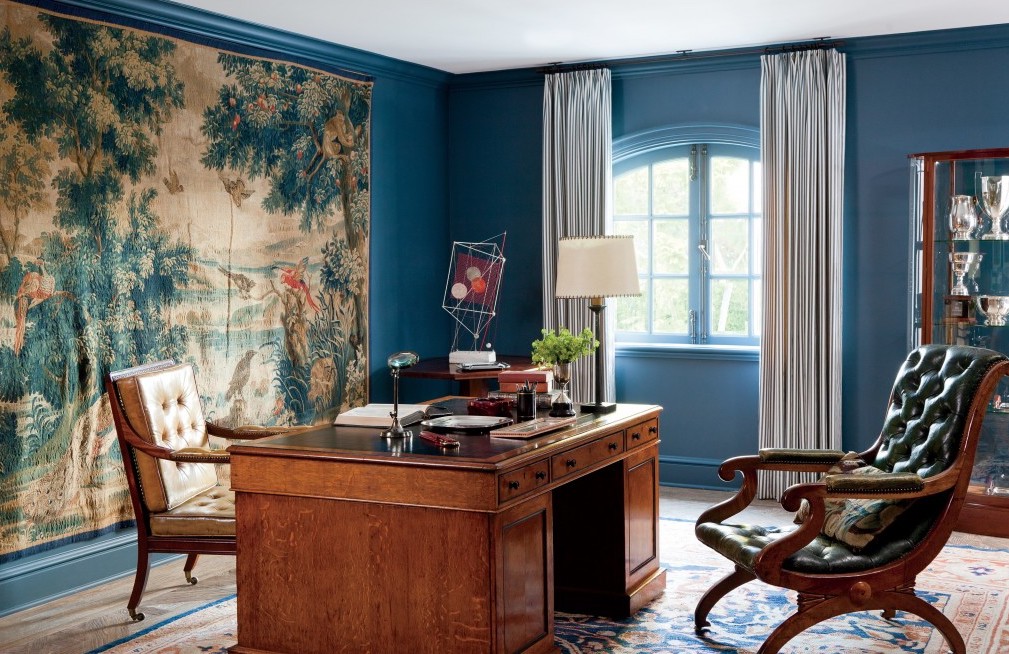 Восточный орнамент гобелена органично вписывается в солидный интерьер дома