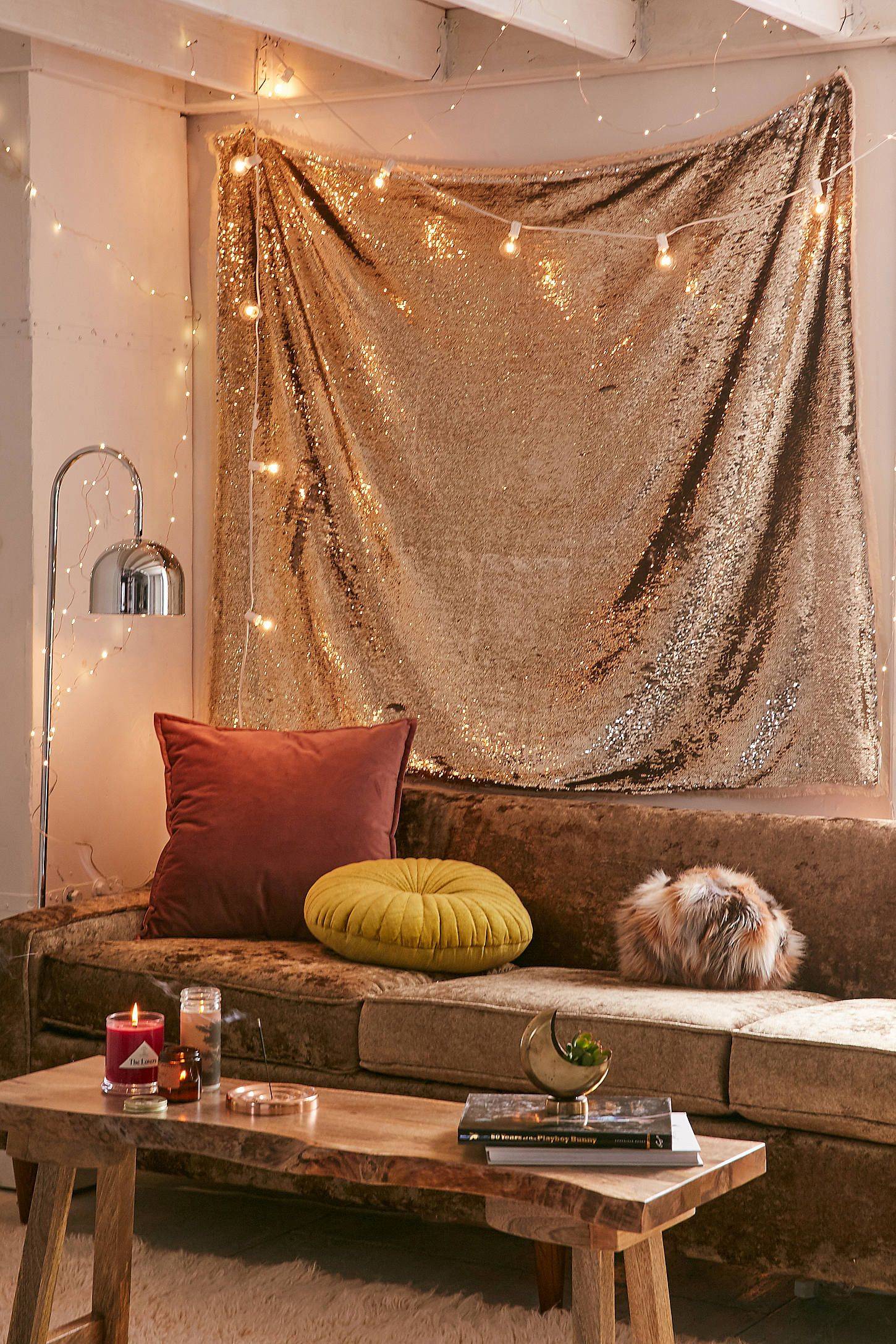 Однако если вы хотите получить что-то более яркое и необычное, у нас есть решение. Для творческих людей подойдет гобелен, полностью обшитый пайетками. Повесьте вдоль стены светильники или гирлянды, которые будут подсвечивать блестящее безумие, за счет этого в комнате заиграют необычные визуальные эффекты.