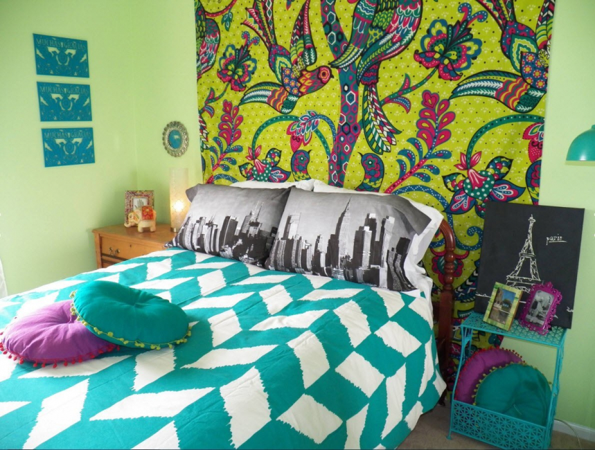 В спальной можно использовать покрывало, хорошие наволочки или тяжелые шторы на окно. Над кроватью может висеть все тоже панно. Закрыв стены можно обеспечить уют. Если стены в квартире тонкие, то это дополнительно обеспечит тепло и звукоизоляцию.