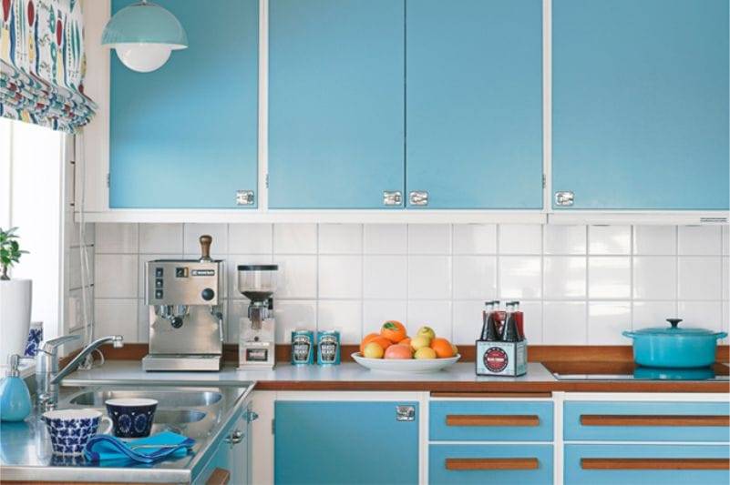 Можно пойти от обратного и оформить в этом цвете не фасады, а технику. Ретро-холодильник и плиты нежного оттенка неба очень оригинально смотрятся в интерьере.