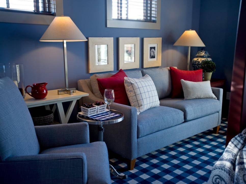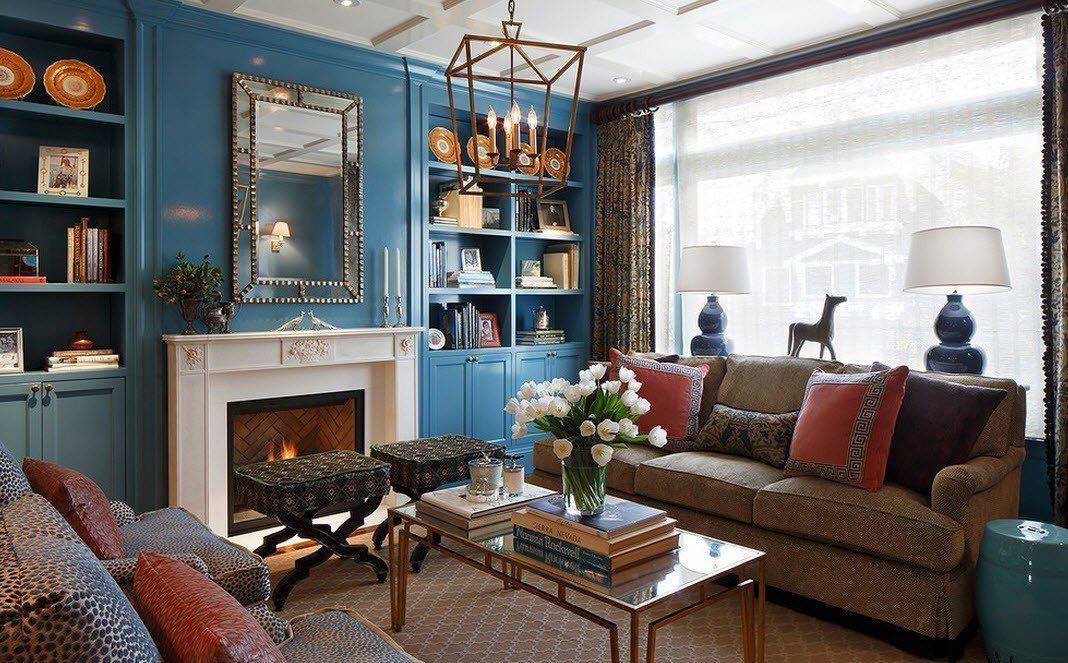 Для гостиной хороший вариант — пастельные, светлые синие тона (васильковый, лазурный, бирюзовый), разбавленные яркими цветовыми акцентами.