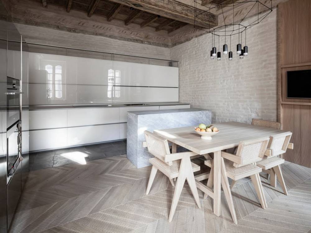 Стиль лофт подходит для больших кухонь-гостиных с высокими потолками. Мебель из дерева и металла, ножки стола и стульев покрашены в черный цвет. Для оформления стен используют кирпичную или каменную кладку. Много хромированных элементов: сантехника, вытяжка, светильники, нарочито открытые системы трубопровода. Оттенки: черный, белый, графитовый, терракотовый, кирпичный, оранжевый, темно-красный.