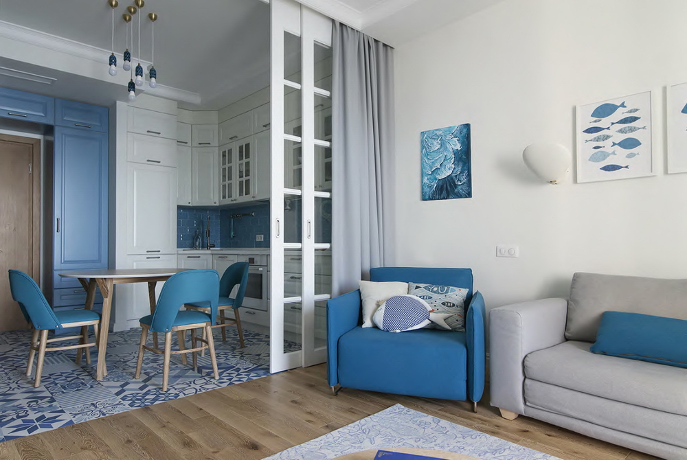 Представьте, будто бы в классической кухне, совмещенной с гостиной. Теперь вы ассиметрично растягиваете двери и мебель, придав им изогнутых форм, добавляете витражей вместо стекла, оптических иллюзий на стены и потолок, делаете главенствующим сочетание белого и голубого цветов. Вы почти у цели!