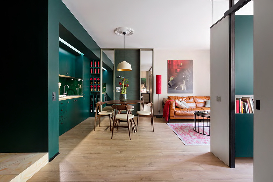 Это может быть кислотных цветов огромный мягкий уголок в гостиной, яркая картина или современная инсталляция. Присутствие яркого акцента «спрячет» и кухню, и что угодно.