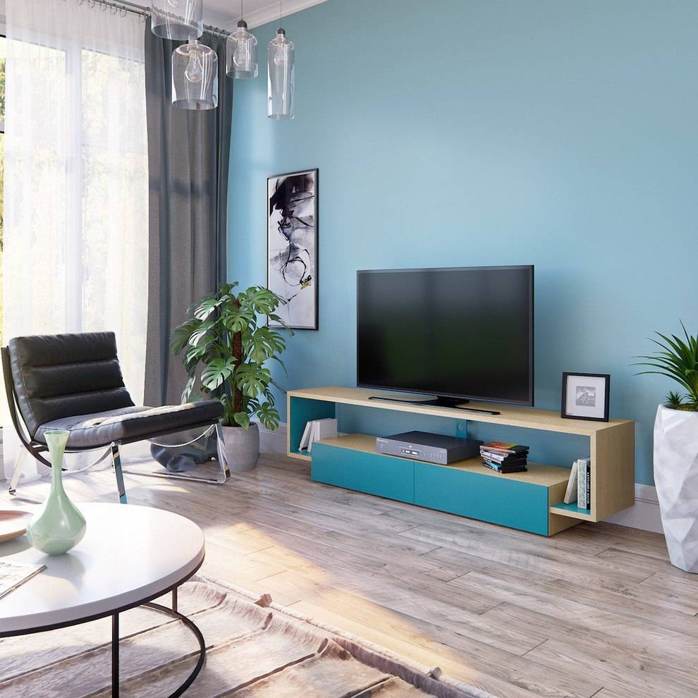 Вы можете выделить одну из стен бирюзовыми обоями с модными геометрическими узорами или цветными кругами. В этом случае лучше выбрать мебель, т.е. Тумба под телевизор, скамейка, полки, комод, стол и стул из натурального дерева. Бирюзовая мягкая мебель лучше всего смотрится с нежным белым или серым рисунком.