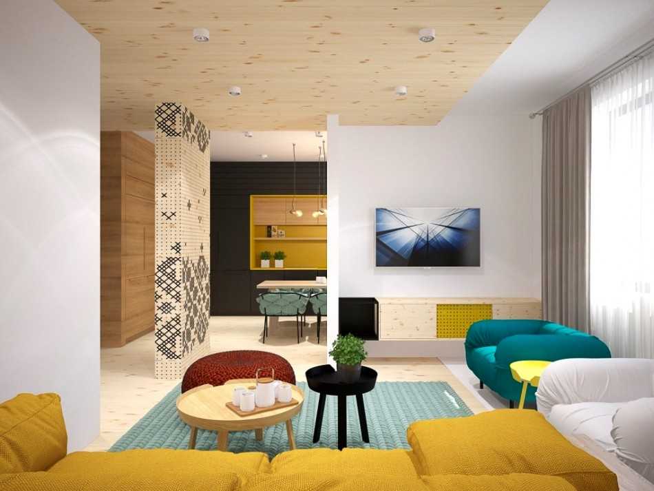 - зонирование пространства (например, с помощью изменения высоты пола и потолка в нужных местах);