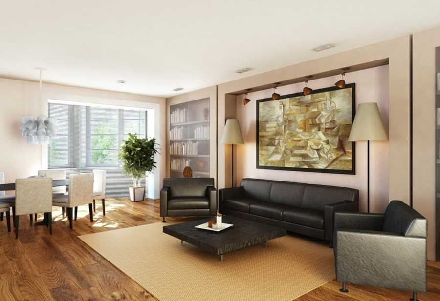 Пол. Для модерна характерно использование паркетных или ламинатных напольных покрытий. Главный принцип: цвет напольного материала и мебели должен совпадать. Для создания уюта можно разместить в гостиной ковровое полотно светлого оттенка.