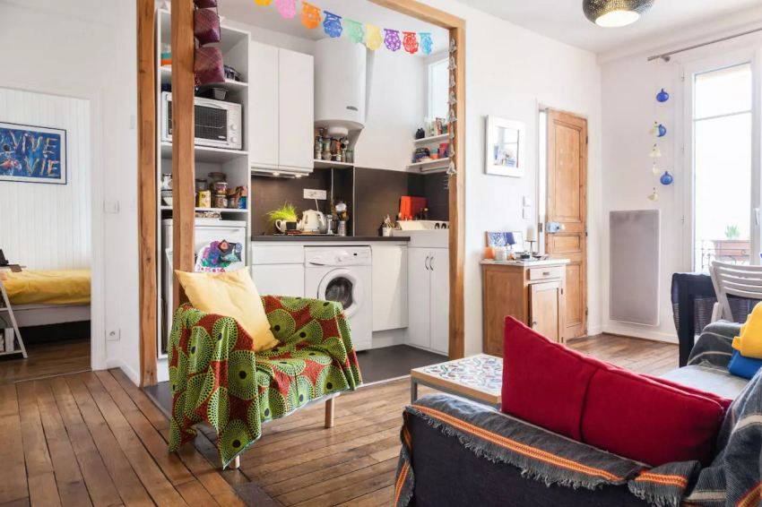 - ✓ При выборе отделки и мебели остановитесь на молочных и бежевых цветах. В маленькой квартире 25 кв.м. выгодно будут выглядеть песочный и его оттенки. Однако яркие цвета тоже не находятся под запретом. Наоборот! С их помощью вы можете создавать особые акценты и разделять зоны.