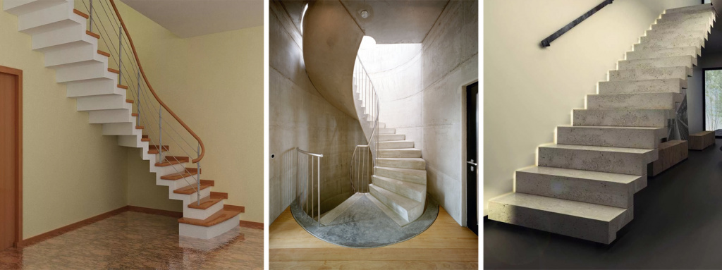 Во всех вариантах ступени выполняются только параллельно полу, и закладные детали для ограждения обязательно должны быть продуманы. Поручни должны быть установлены для обеспечения безопасности во время ходьбы.