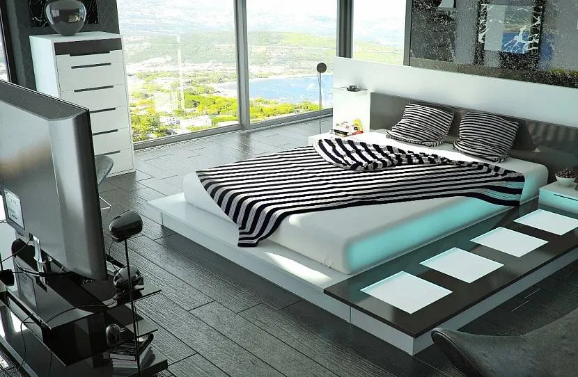В спальне особое внимание уделяется кровати. Для придания помещению атмосферы футуризма подойдет кровать с подсветкой, вместительными бельевыми ящиками, регулируемой спинкой, современной системой трансформации. Рядом со спальным ложем устанавливаются прикроватные тумбочки простых и сдержанных форм
