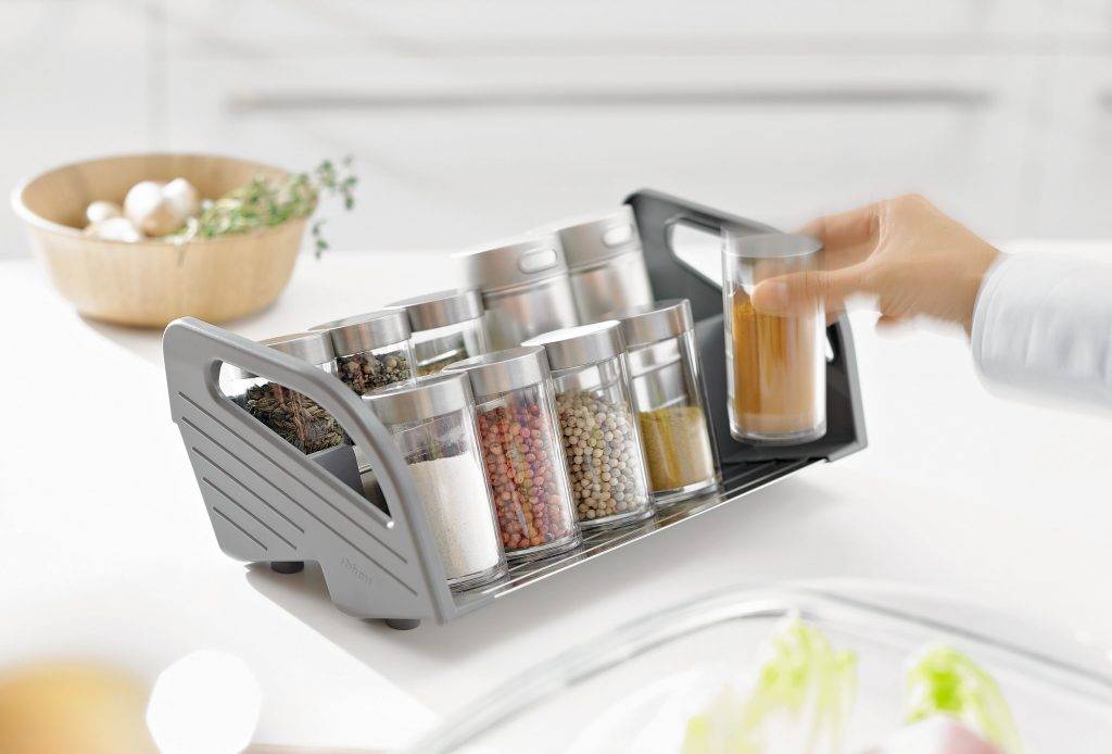 Такое решения дает еще одно дополнительное преимущество — возможность легко перемещать специи с места на место, что может быть очень полезно с практической точки зрения. Например, если вы хотите, чтобы все приправы находились под рукой во время приготовления пищи, но вам не нравится идея открытого хранения из-за оседающей на них пыли и грязи, то хранение на подставке станет для вас самым оптимальным вариантом: перед началом приготовления достаточно поставить ее у варочной панели, а после — просто убрать в шкаф.