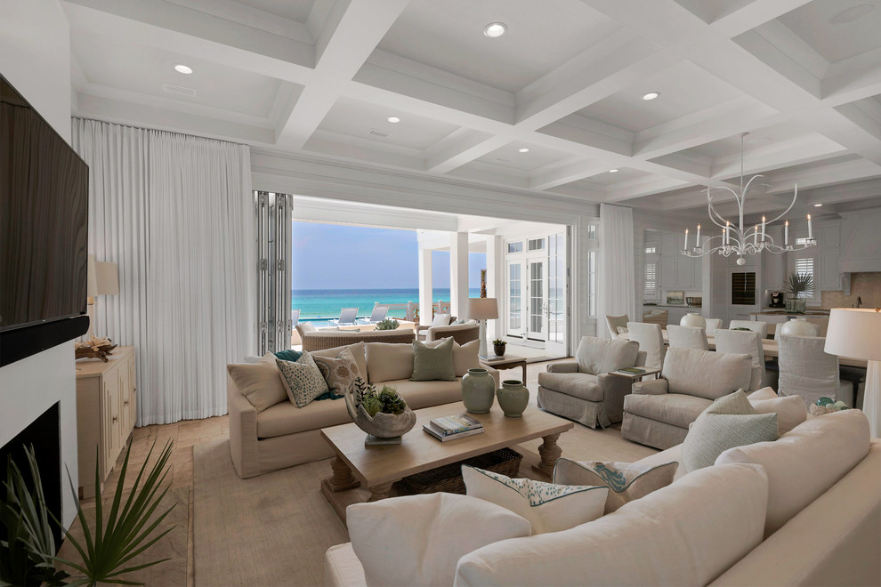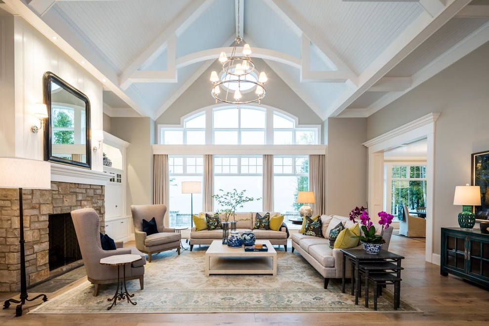 Особое внимание следует уделить освещению в просторных гостиных загородного дома. Учитывая тот факт, что просторная гостиная объединяет в себе множество зон, то практичнее будет помимо основного центрального освещения предусмотреть достаточное количество локального света в виде торшеров, бра и настольных ламп