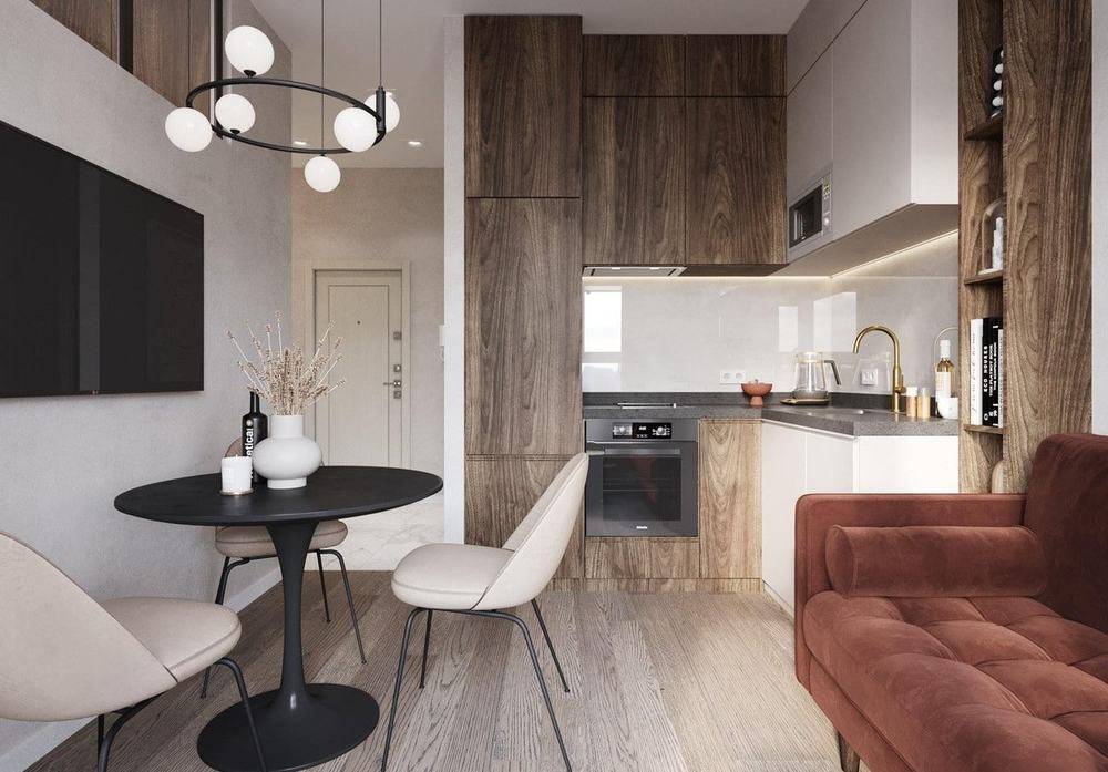 Выбор способа зависит от размеров гостиной. Если она маленькая, лучше всего снести стену полностью. В пограничной зоне можно разместить барную стойку со стульями или полноценный обеденный гарнитур в зависимости от размеров помещения и количества членов семьи. Освободившееся пространство может использоваться для размещения холодильника.