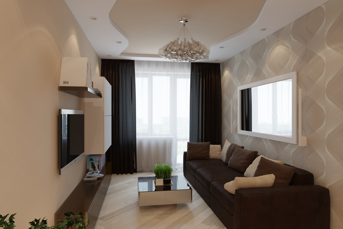 В большинстве случаев, гостиная 15 кв. м. представлена в виде прямоугольника, вытянутого в сторону единственного окна. Разбивка на зоны здесь осуществляется по классическому принципу: проходное место остаётся под «гостиную», участок возле окна – превращается в «спальню». Если кровати в комнате не будет, планировка начинается после того, как будет утверждено место самого громоздкого элемента – дивана. Тот, в свою очередь размещается в месте, где лучше всего просматривается телевизор и входная дверь.