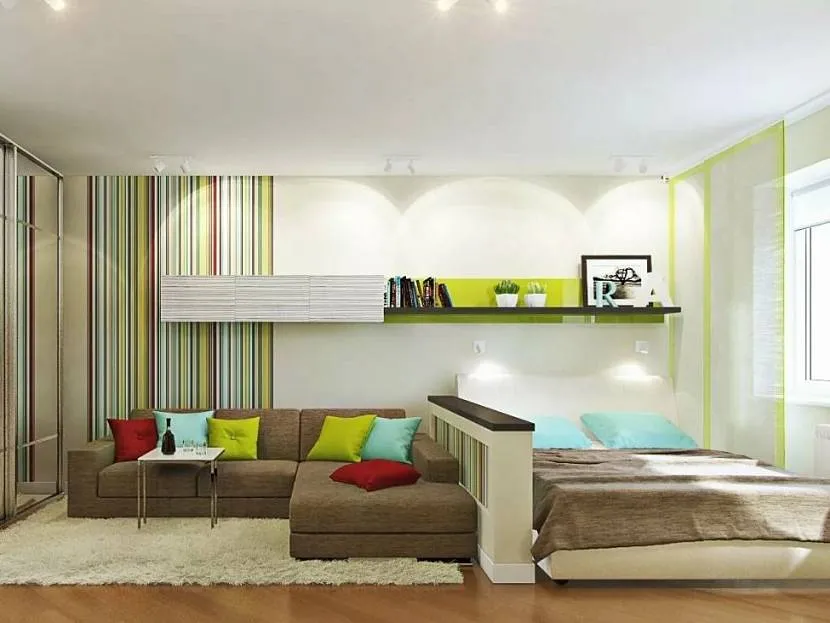 Зонирования помещения можно добиться при помощи цветового оформления. Для гостиной можно выбрать более глубокие цвета, а для спальни – нежные и приглушенные.