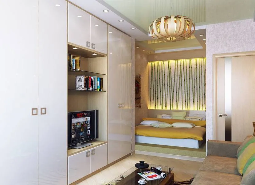 Сэкономить пространство поможет модульная стенка или несколько открытых полок для хранения вещей, а также угловой шкафчик для одежды и белья. Стандартный диван можно заменить на угловую модель, дополненную полочкой или мини-баром. От дивана можно и вовсе отказаться, поставив вместо него несколько пуфов или кушетку. Вместо тумбы, занимающей место, телевизор можно повесить на стену.