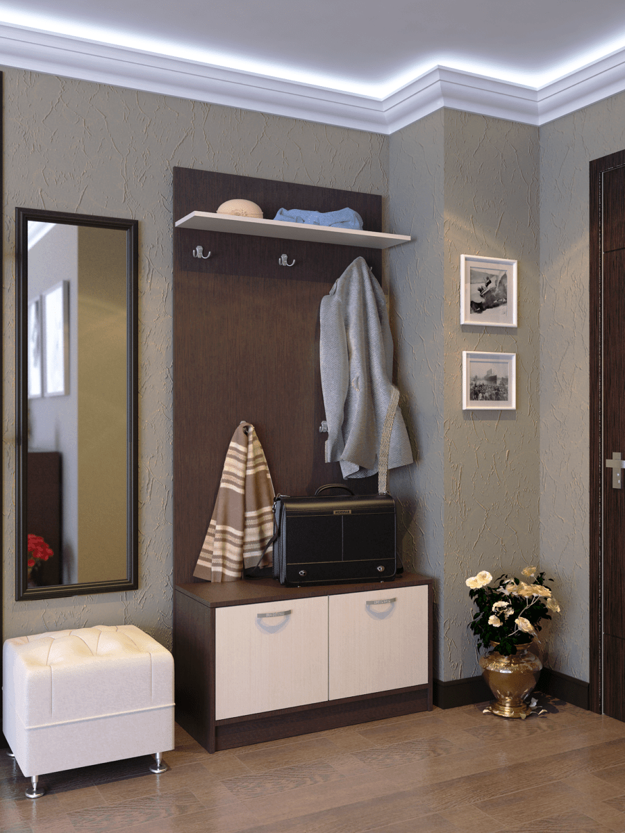Хорошо, если ширина прихожей позволяет поместить в ней хотя бы маленький пуф, на котором можно обуваться сидя. Если такой возможности нет, нужно понимать, что одна из стен будет испытывать повышенную нагрузку: об неё облокачиваются, когда обуваются стоя.