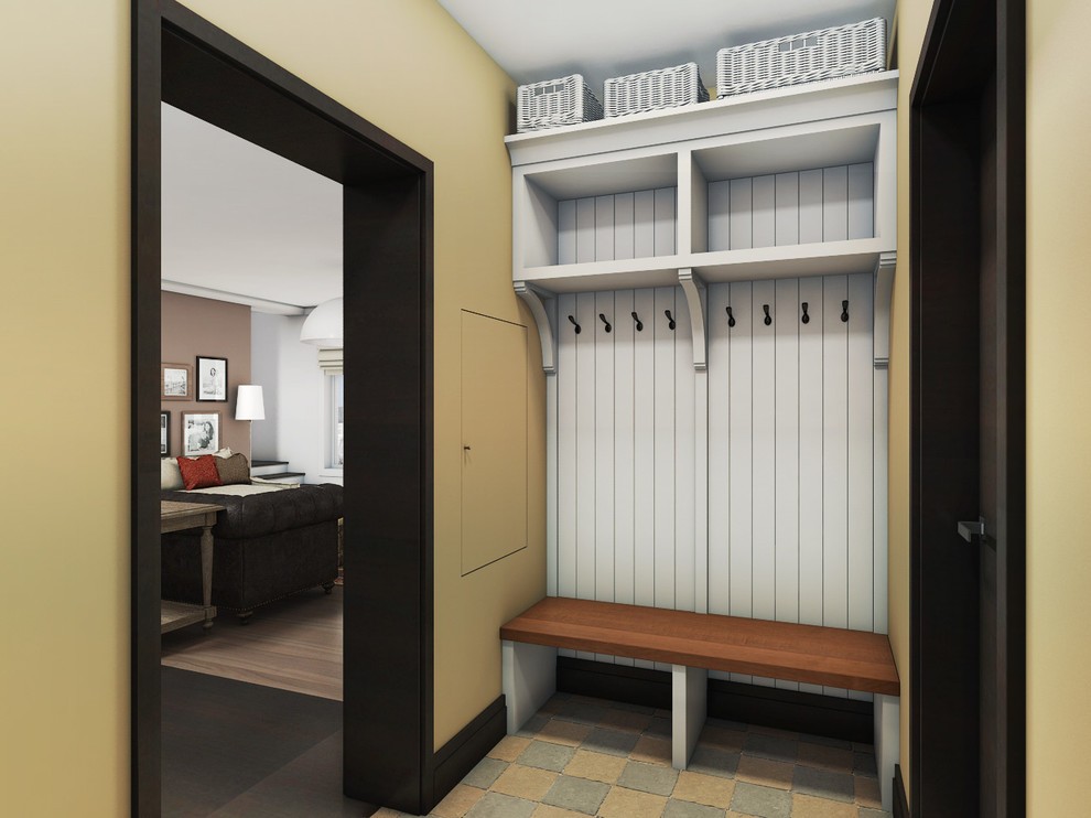 - Зона прихожей, сопряженная с кухней. Если места настолько мало, что на прихожую выделено всего несколько квадратных метров, она плавно переходит в кухню, стоит использовать прием зонирования помещений. Коридор можно отделить контрастной плиткой. Около двери установить нишу, где есть вешалки, сиденья, антресоли и место для уличной обуви. Все это не допустит загрязнения остальных помещений. Простое и лаконичное оформление, но при этом очень функциональное.