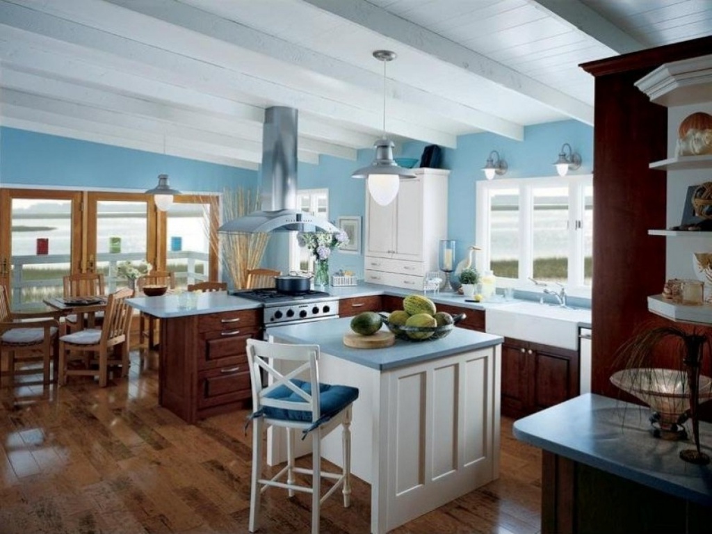 При желании некоторые фасады можно перекрасить в белый, голубой или бирюзовый цвет. Такая палитра будет гармонично сочетаться со светлыми породами дерева. Отдельные части кухни украсьте с помощью ракушек, керамики или гальки.