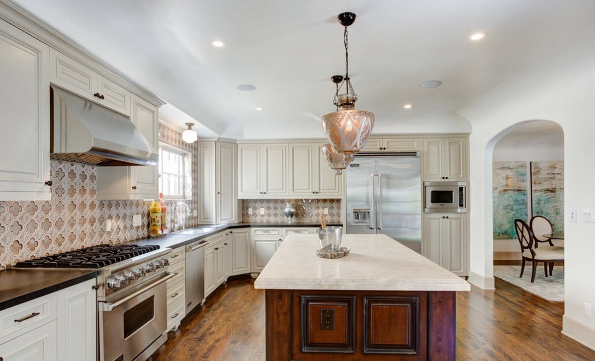 В такой кухне обязательно разделение на рабочую и обеденную зону. Используйте крупную стойку, оформленную в старинном стиле.