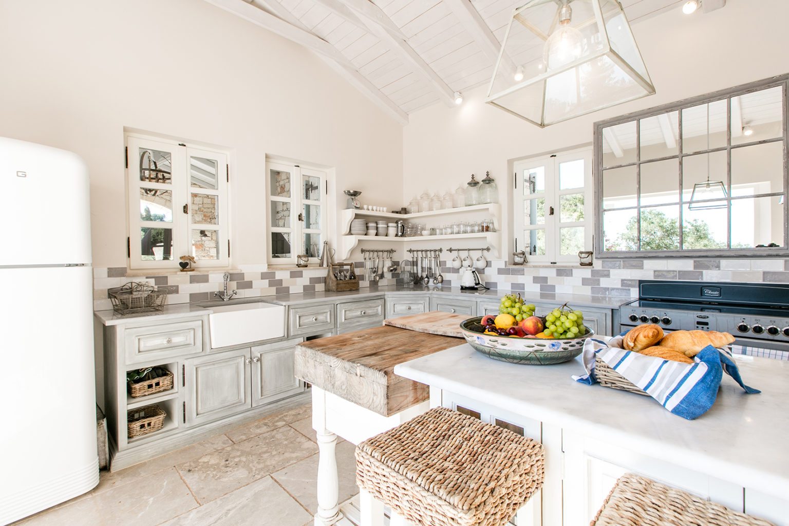Однако учтите, что ставить такую мебель можно только в том случае, если на кухне все равно остается свободное место — греческий стиль не терпит захламленности.