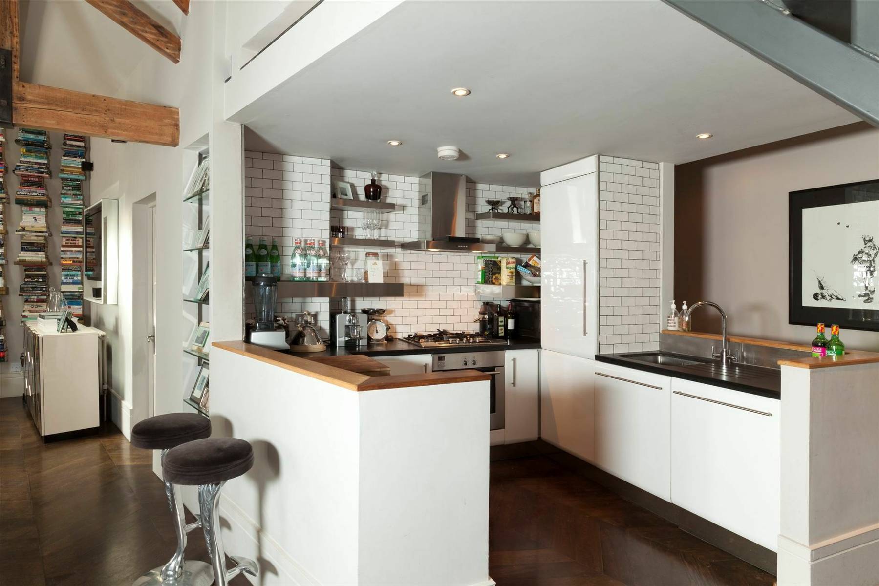 Выделите угловую зону или длинную стену под рабочие поверхности, а обеденную зону перенесите в противоположную сторону комнаты, чтобы сохранить пространство в центре.