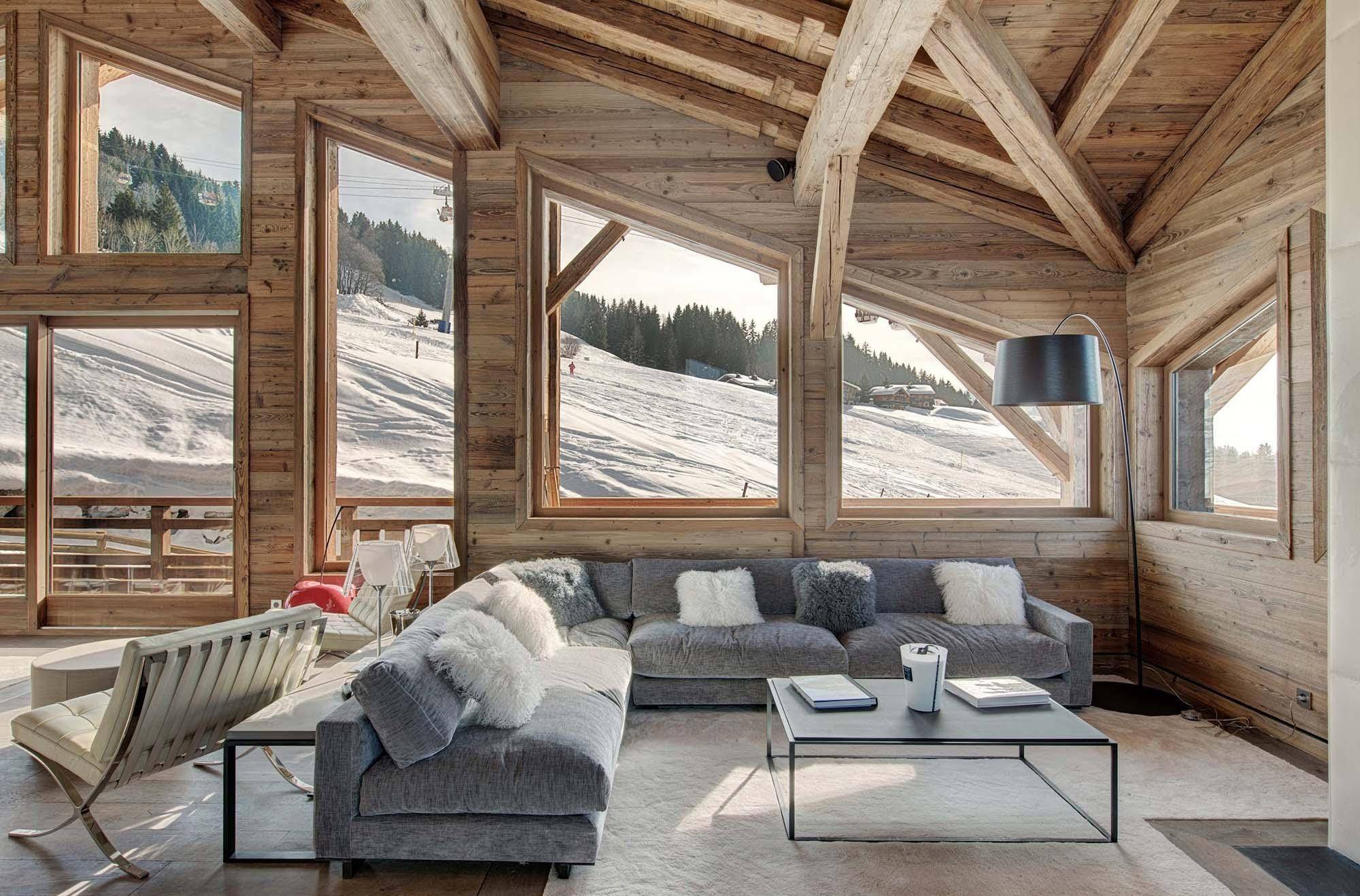 Массивная мягкая мебель и камин — важные элементы гостиной в стиле шале