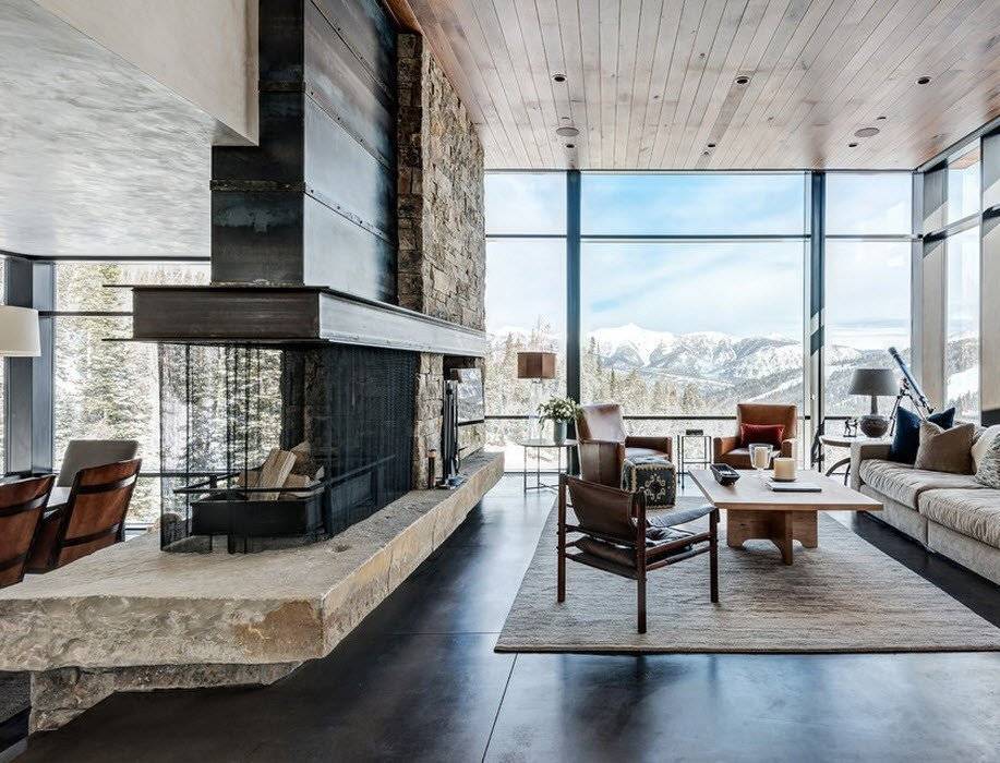 Массивная мягкая мебель и камин — важные элементы гостиной в стиле шале